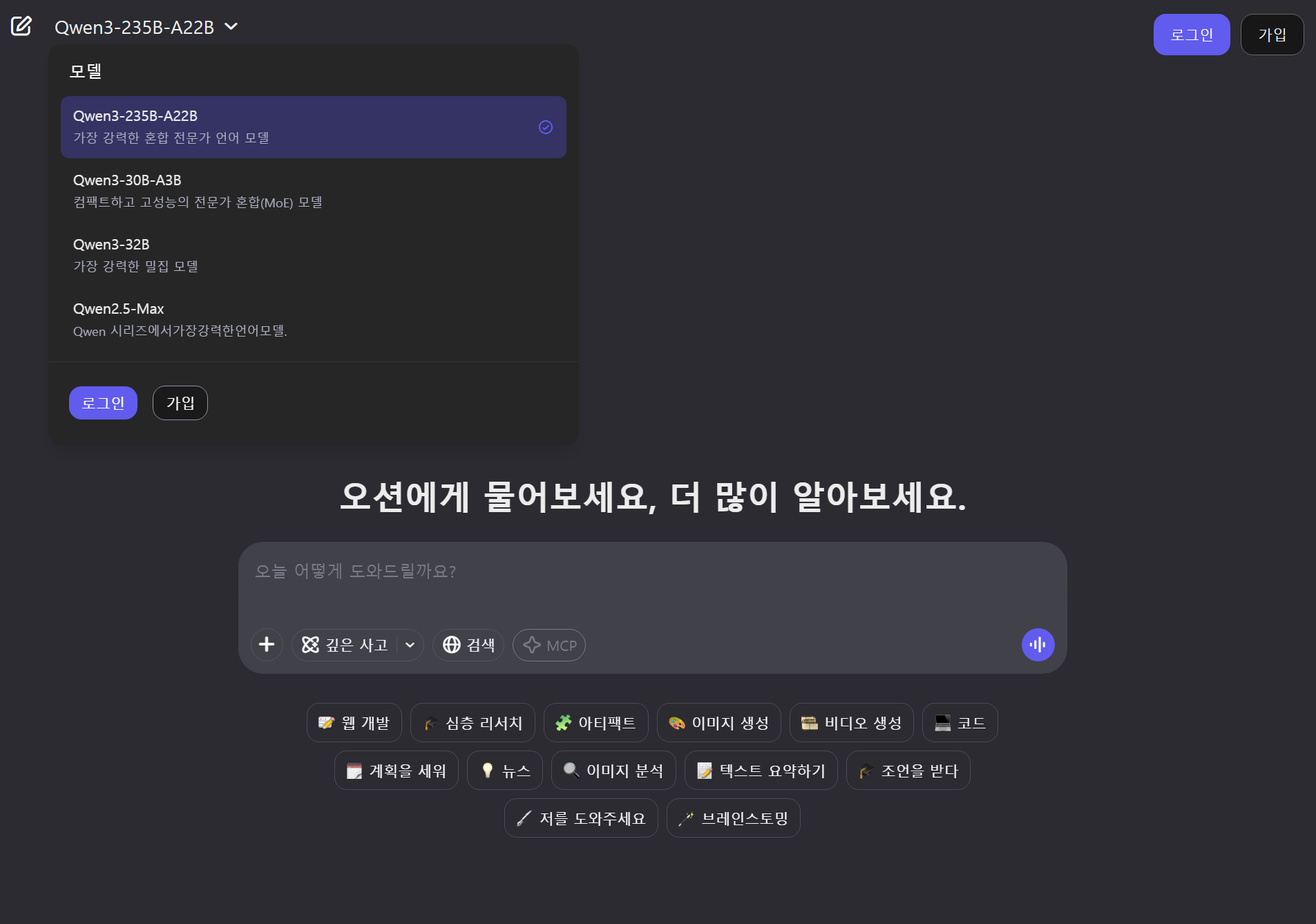 - Thinking / DeepSearch / DeeperSearch 등 심화 기능 활성화