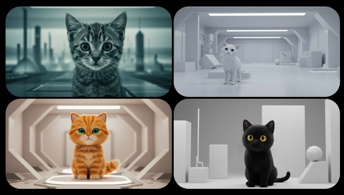 생성된 이미지는 귀여운 고양이의 다양한 모습으로 나타났으며, 조명, 배경, 화풍이 자동 적용되어 깔끔한 결과물이 나왔습니다.