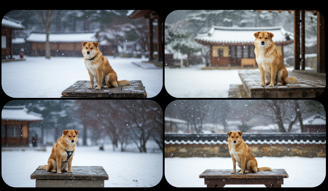 한글: 눈 오는 날, 전통 한옥 마루에 앉은 강아지 → 영어: On Snowy Day, Dog Sitting on Traditional Hanok Maru