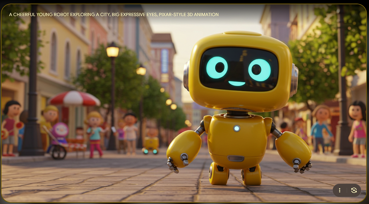 | 픽사 스타일 | A cheerful young robot exploring a city, big expressive eyes, Pixar-style 3D animation |