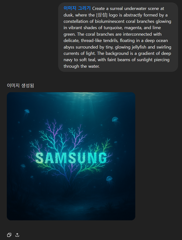 Create a surreal underwater scene at dusk, where the [삼성] logo is abstractly formed by a constellation of bioluminescent coral branches glowing in vibrant shades of turquoise, magenta, and lime green. The coral branches are interconnected with delicate, thread-like tendrils, floating in a deep ocean abyss surrounded by tiny, glowing jellyfish and swirling currents of light. The background is a gradient of deep navy to soft teal, with faint beams of sunlight piercing through the water.